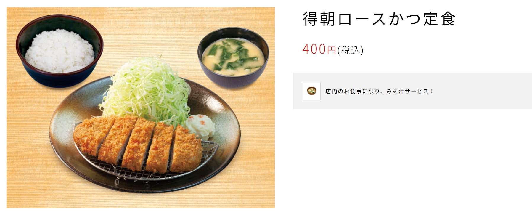 なんと朝からたったの400円でとんかつ定食が食べられる。