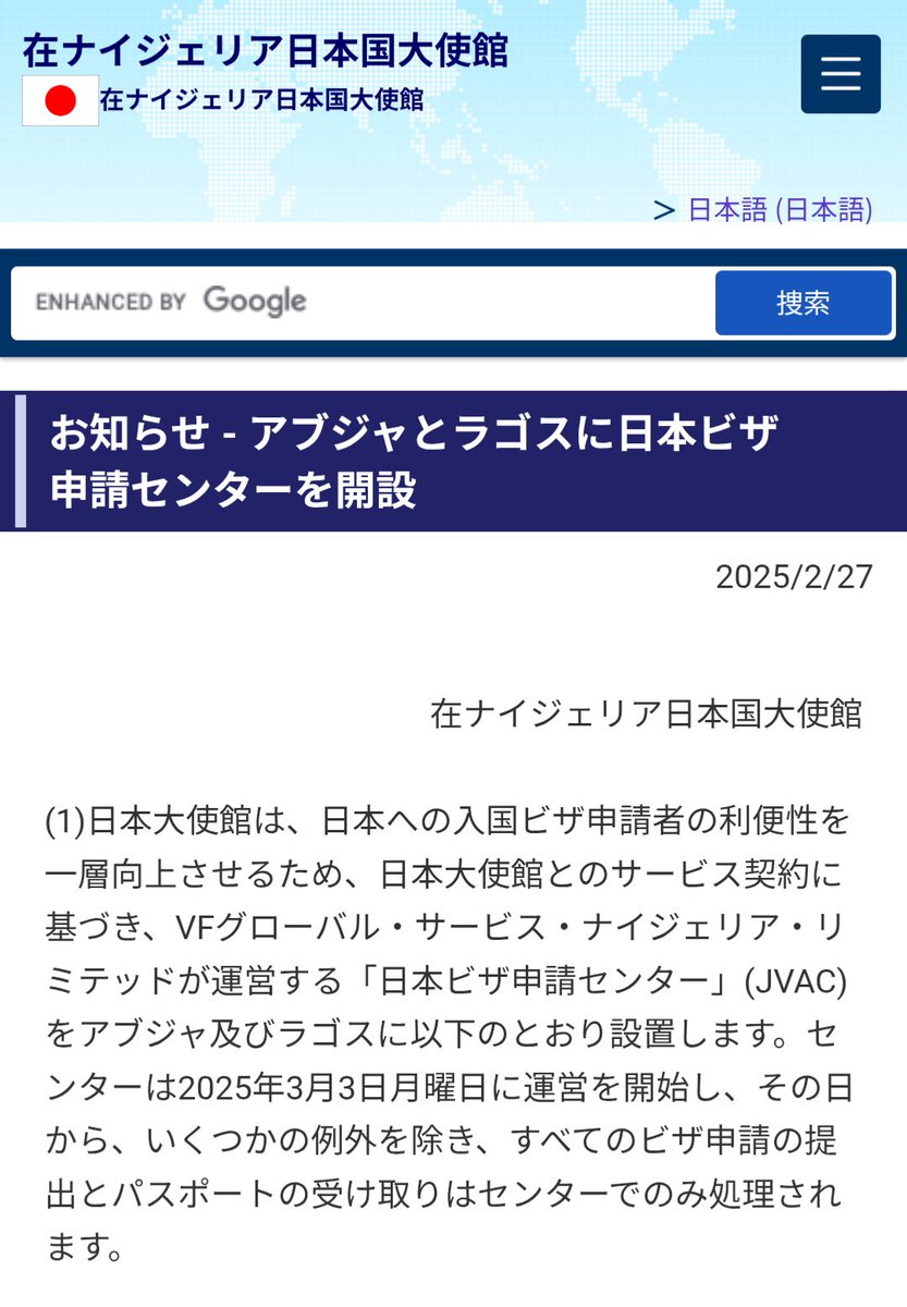 在ナイジェリア日本大使館がナイジェリアに今年から2ヶ所ビザ申請センター設置してるよ?