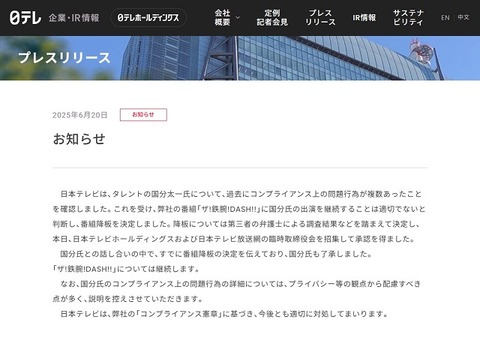日テレ「では弁明の場を用意しますのでどうぞ会見を」
