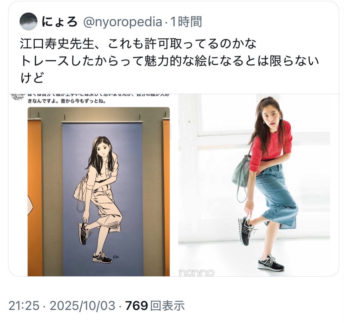 >>1 > 2024年9月に納品されたイラストにつきましては、江口氏より、雑誌等特定の写真からの引用はないと回答いただきました。 ほら江口から挑戦状来たぞ パクリ元見つけられるもんなら見つけてみろって
