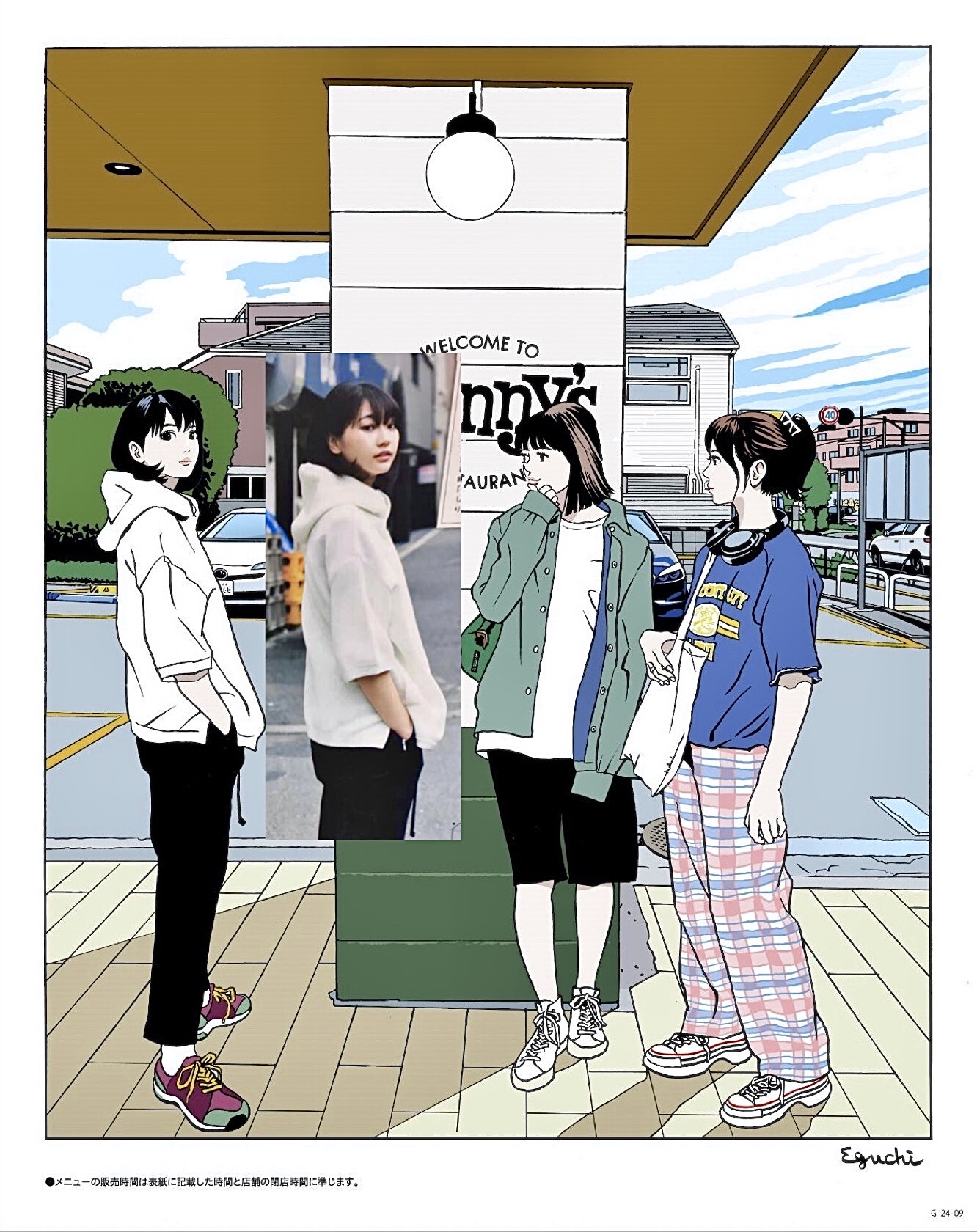 2024 年 9 月に納品されたイラストにつきましては、江口氏より、雑誌等特定の写真からの引用はない と回答いただきました この時の左側の白いパーカーの女の子特定されてたよね? デニーズさん把握してないのかな 問い合わせ誰かしないか メンズノンノ 2016年6月号 武田玲奈さんの写真 靴の色まで全部一緒なんだが