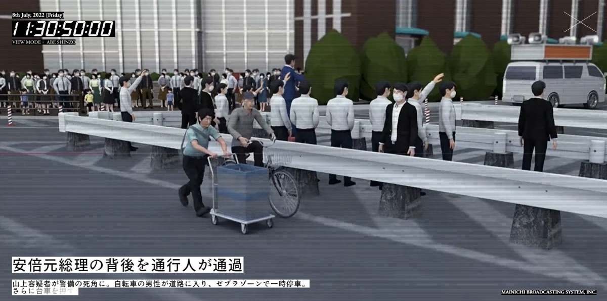 被告 「銃撃するなら、後方から撃てば、射線が通るなと思っていた。後方が空いていた、撃つならこの方向だと。真後ろに警備員がいたのでどうしたものか、このまま演説が終わってしまうのではないか(と思った)。変わりに向こうから、横とか前方とかがいいのかなと(考えていた)。そうしたら警備員が私が(行ってほしいと)考えていた方向に移動した。これも偶然とは思えない何かと思った。自転車とか台車の人が横断して、警備の目がそれに逸れた。いまかと思い、車道に入った」