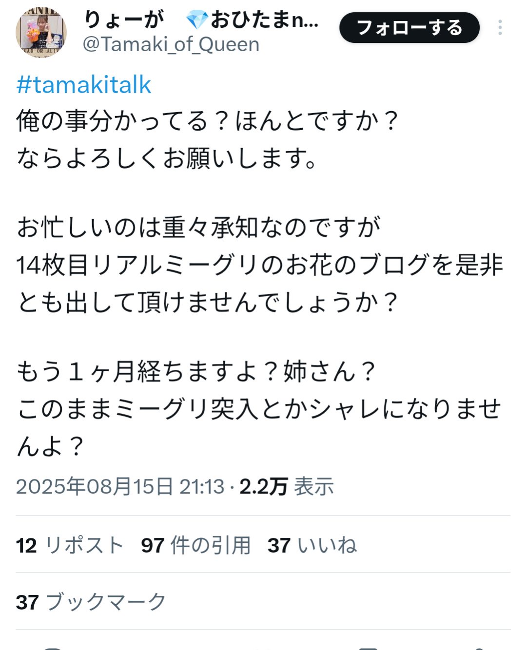 坂道オタクさん、俺の送った花がブログに載ってないと激怒