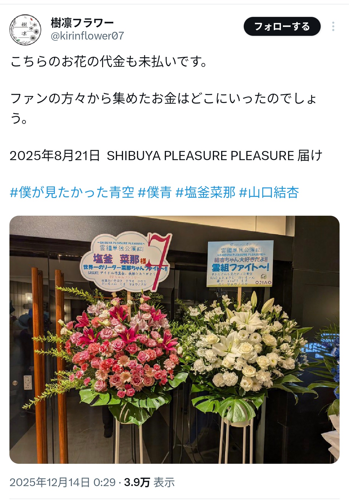 【闇深】乃木坂46オタクさん、ファンから集めた花代(50万円以上)を持ち逃げ、花屋が大損害wwwwwwwww